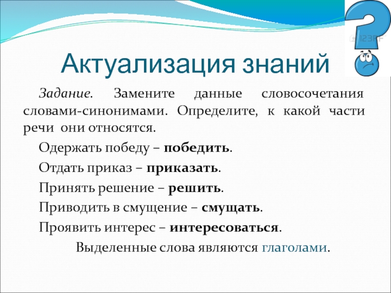 Задание. Замените данные словосочетания словами-синонимами. Определите, к какой части речи