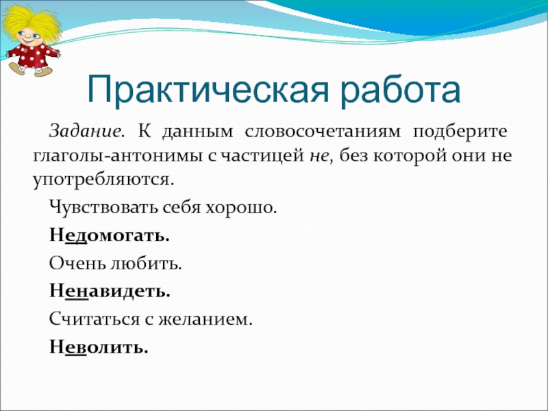Задание. К данным словосочетаниям подберите глаголы-антонимы с частицей не, без