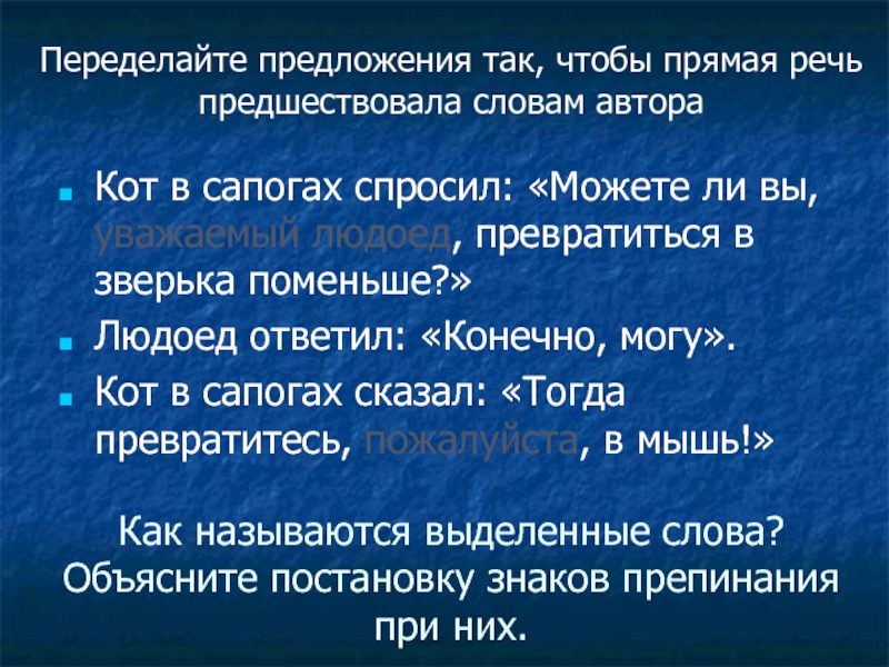 Переделайте предложения так, чтобы прямая речь предшествовала словам автора