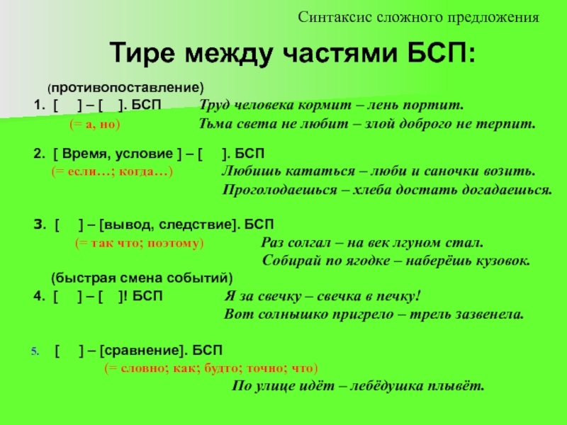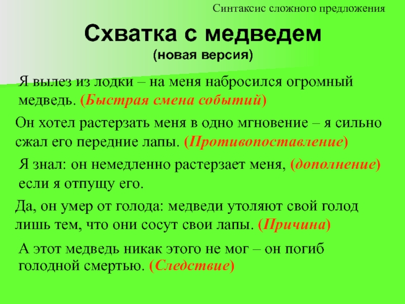 Он хотел растерзать меня в одно мгновение – я сильно сжал его передние лапы. (Противопоставление)