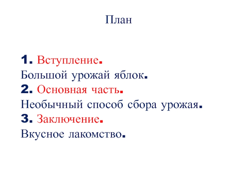 План1. Вступление.Большой урожай яблок.2. Основная часть.Необычный способ сбора урожая.3. Заключение.Вкусное лакомство.
