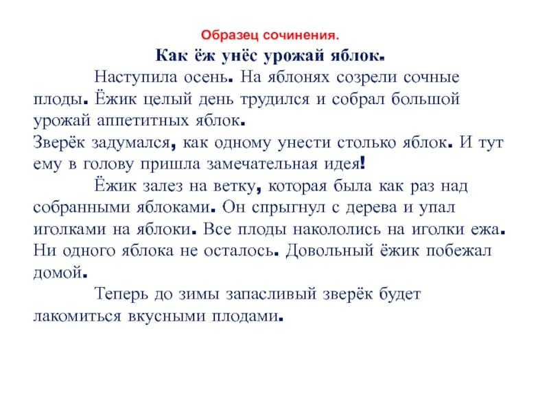 Образец сочинения. Как ёж унёс урожай яблок.      Наступила осень. На яблонях созрели