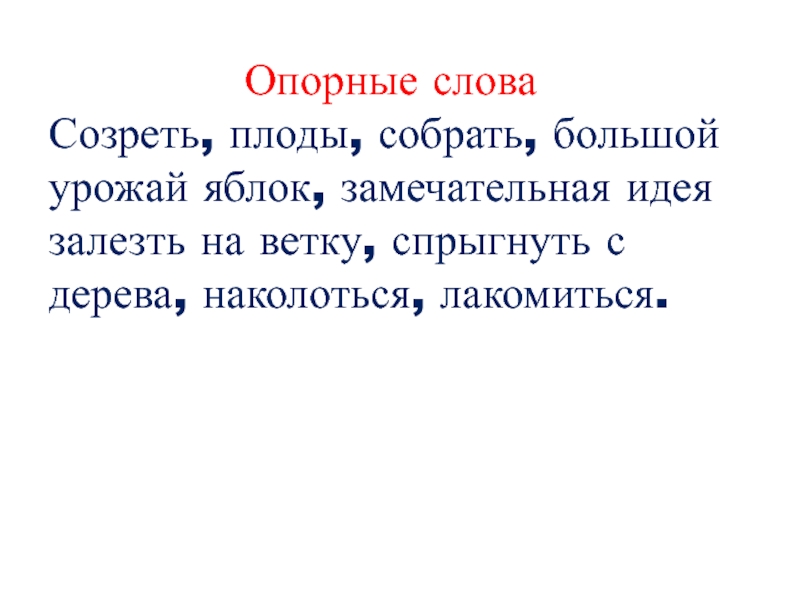 Опорные словаСозреть, плоды, собрать, большой урожай яблок, замечательная идея залезть на ветку, спрыгнуть с дерева, наколоться, лакомиться.