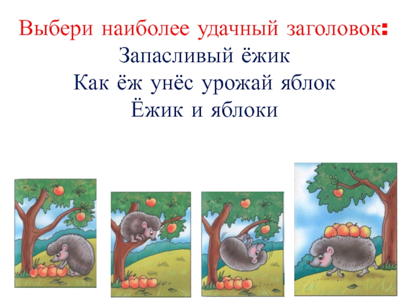 Выбери наиболее удачный заголовок:Запасливый ёжикКак ёж унёс урожай яблокЁжик и яблоки