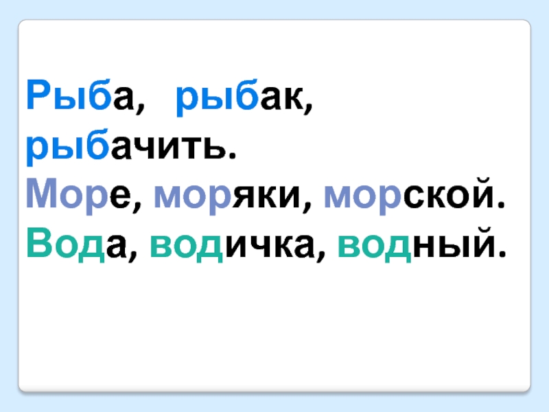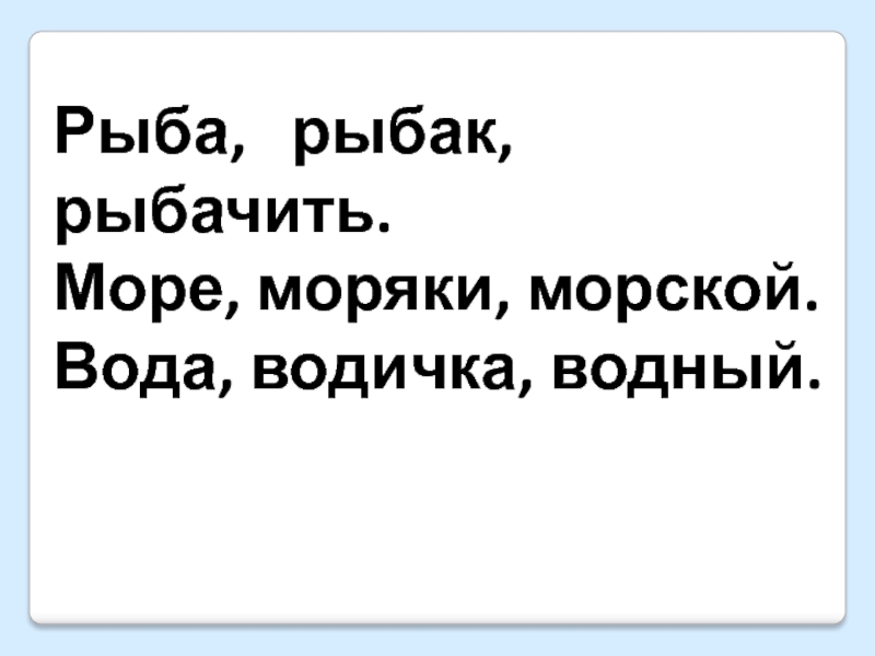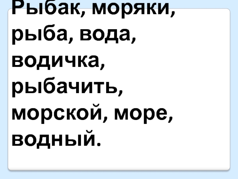 Рыба,  рыбак, рыбачить.Море, моряки, морской.Вода, водичка, водный.