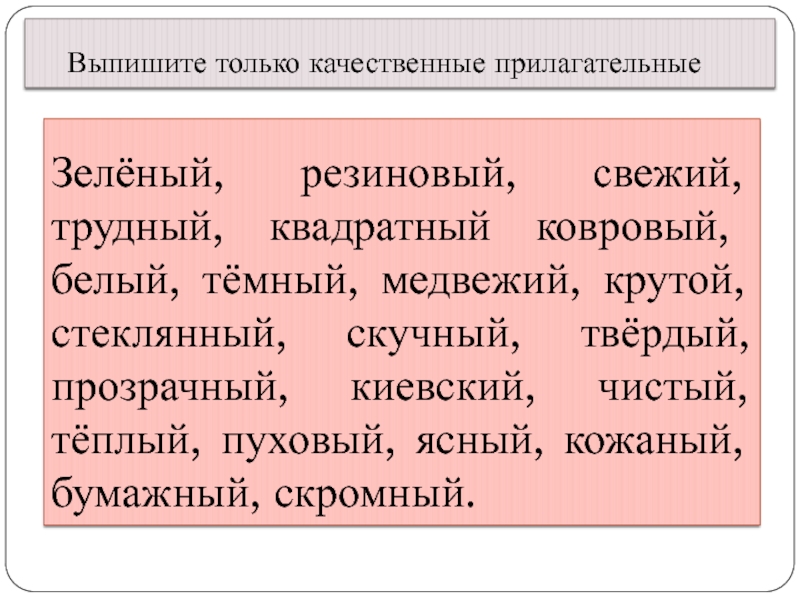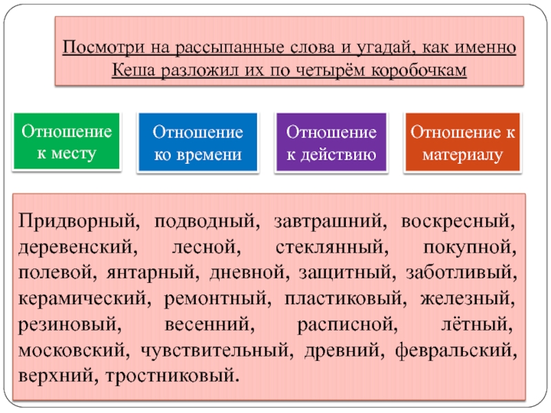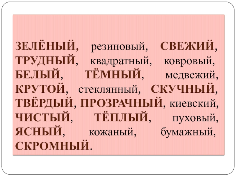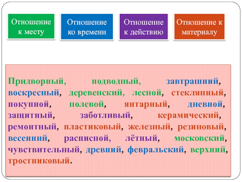 Придворный, подводный, завтрашний, воскресный, деревенский, лесной, стеклянный, покупной, полевой, янтарный, дневной, защитный, заботливый, керамический, ремонтный, пластиковый, железный, резиновый, весенний, расписной, лётный, московский, чувствительный, древний, февральский, верхний, тростниковый.