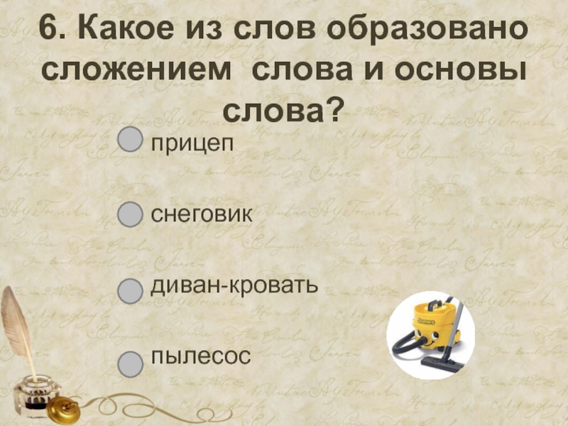 6. Какое из слов образовано сложением слова и основы слова?прицепснеговикдиван-кроватьпылесос
