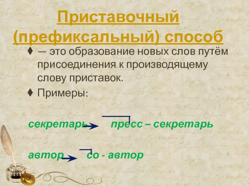 Приставочный (префиксальный) способ— это образование новых слов путём присоединения к производящему слову приставок.Примеры:  секретарь