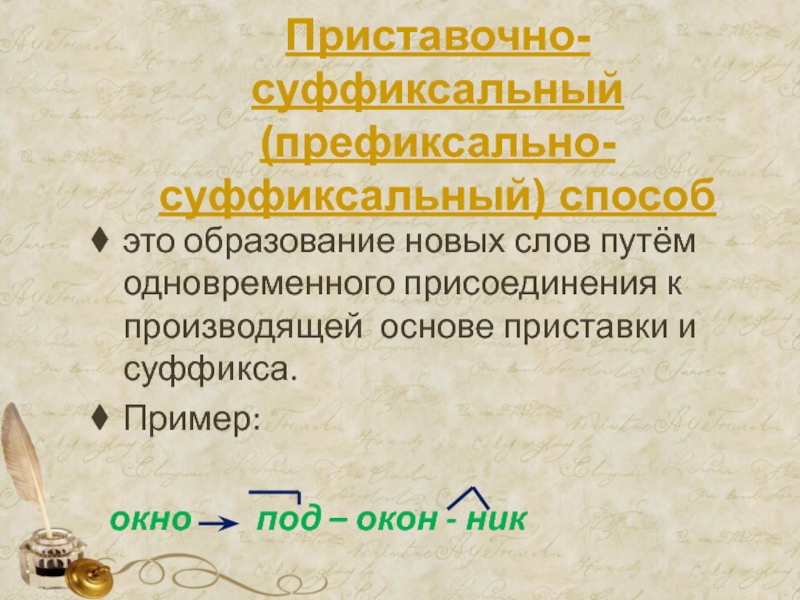 Приставочно-суффиксальный (префиксально-суффиксальный) способ это образование новых слов путём одновременного присоединения к производящей  основе приставки и  суффикса.Пример: окно