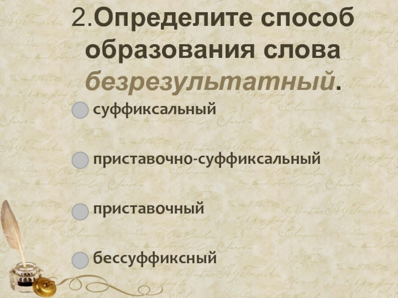 Слайд 14 2.Определите способ образования слова безрезультатный.