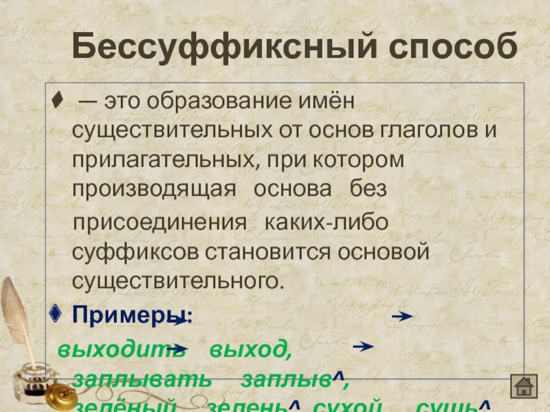 Бессуффиксный способ — это образование имён существительных от основ глаголов и прилагательных, при котором   производящая   основа   без