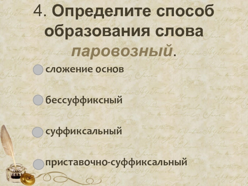4. Определите способ образования слова паровозный.сложение основбессуффиксныйсуффиксальныйприставочно-суффиксальный