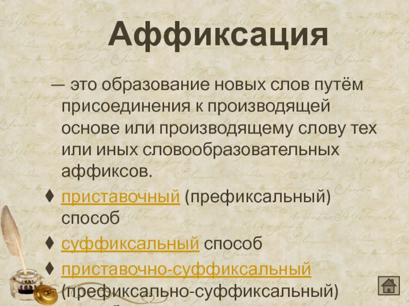 Аффиксация — это образование новых слов путём присоединения к производящей основе или производящему слову тех или иных словообразовательных