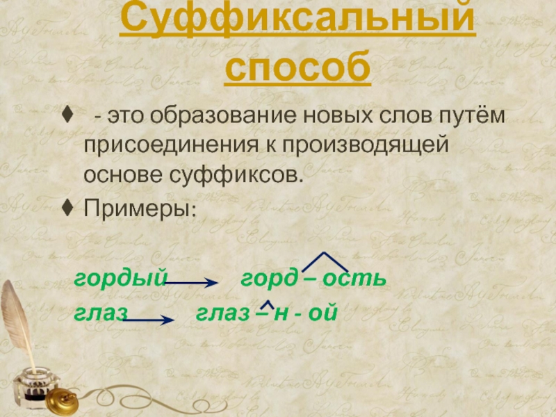 Суффиксальный способ  - это образование новых слов путём присоединения к производящей основе суффиксов.Примеры: гордый