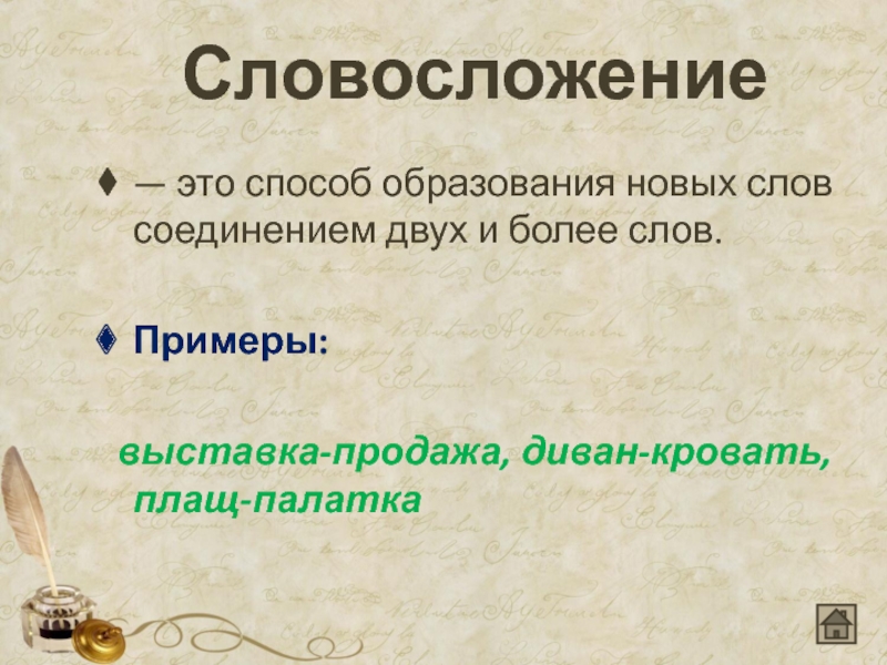 Словосложение — это способ образования новых слов соединением двух и более слов.Примеры: выставка-продажа, диван-кровать, плащ-палатка