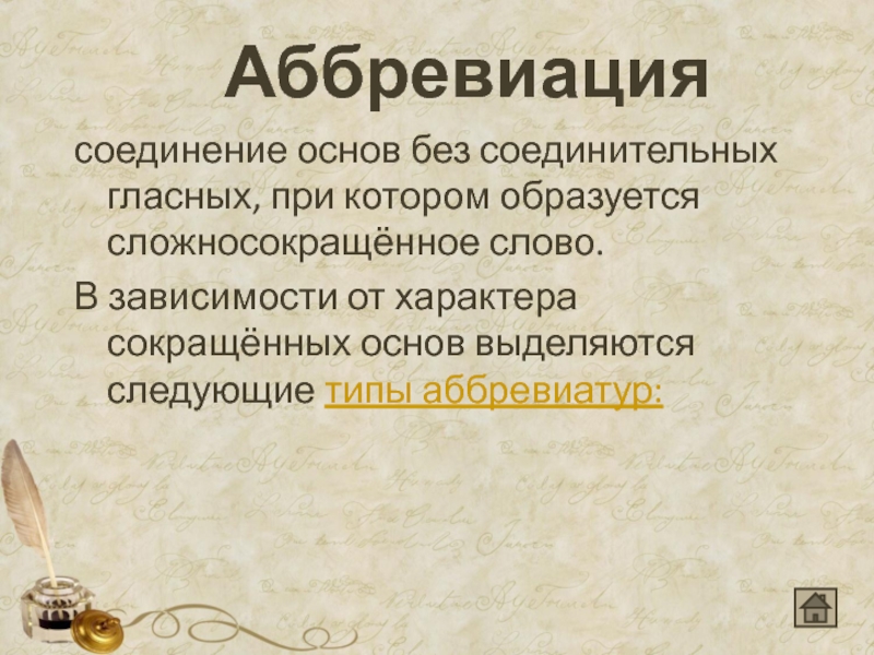 Аббревиациясоединение основ без соединительных гласных, при котором образуется сложносокращённое слово.В зависимости от характера сокращённых основ выделяются следующие