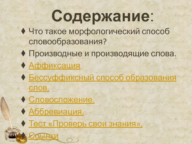 Содержание:Что такое морфологический способ словообразования?Производные и производящие слова.Аффиксация Бессуффиксный способ образования слов.Словосложение.Аббревиация.Тест «Проверь свои знания».Ссылки