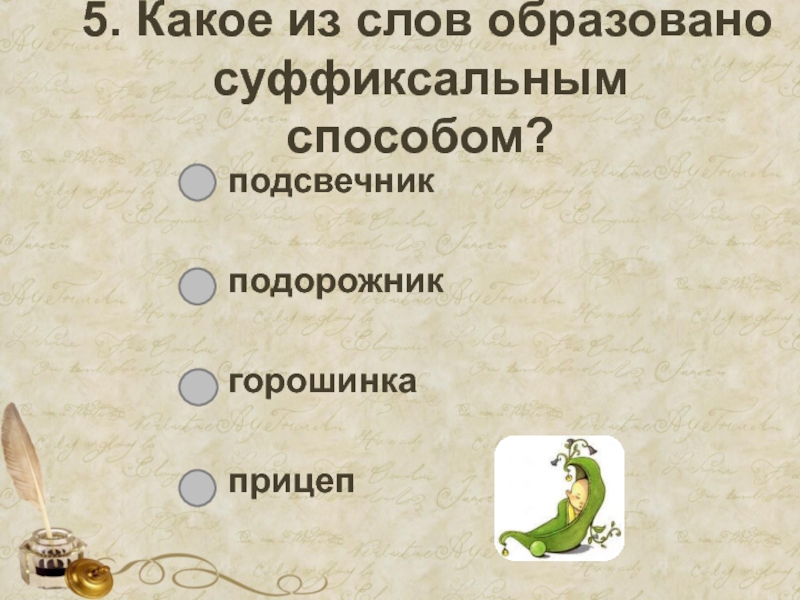 5. Какое из слов образовано суффиксальным способом?подсвечникподорожникгорошинкаприцеп