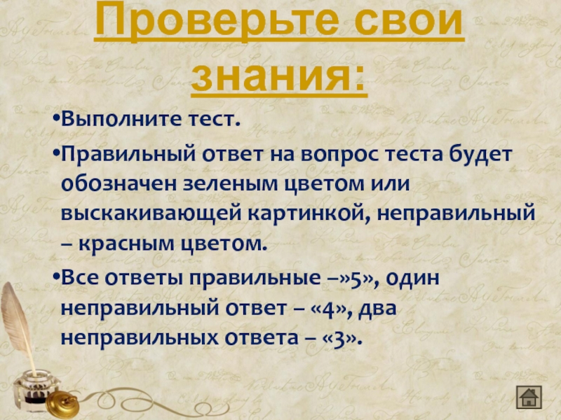 Проверьте свои знания:Выполните тест.Правильный ответ на вопрос теста будет обозначен зеленым цветом или выскакивающей картинкой, неправильный –