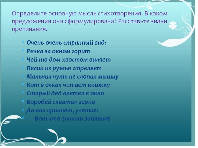 Определите основную мысль стихотворения. В каком предложении она сформулирована? Расставьте знаки препинания.