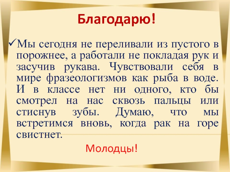 не покладая рук и засучив рукава. Чувствовали себя в мире фразеологизмов как рыба в воде. И в классе нет ни одного, кто бы смотрел на нас сквозь пальцы или стиснув зубы. Думаю, что мы встретимся вновь, когда рак на горе свистнет.
