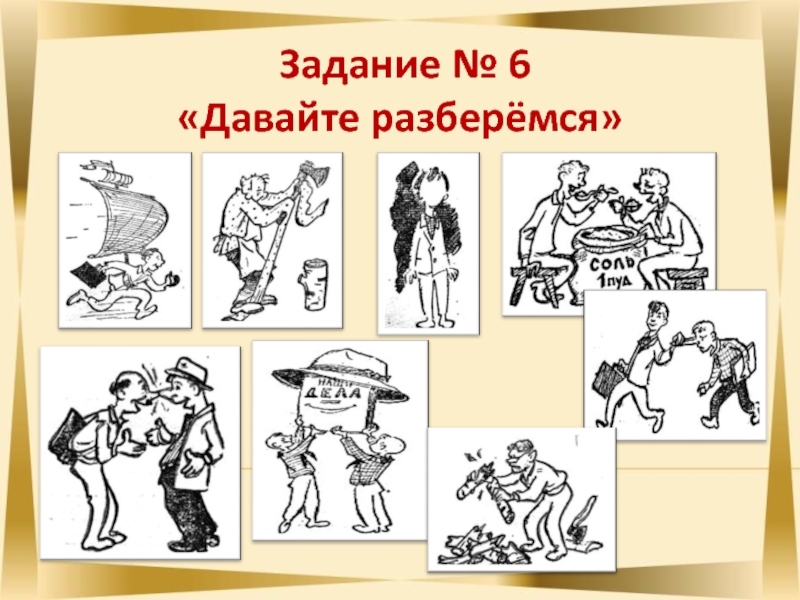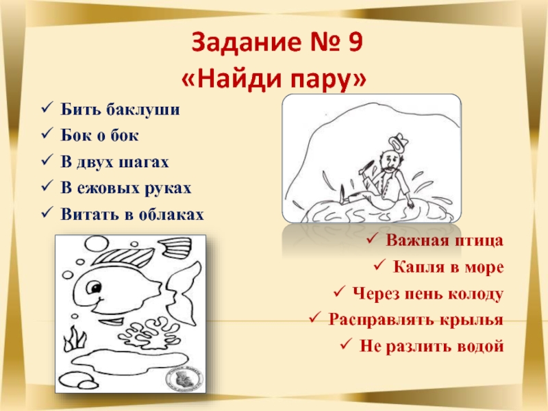 идиома изображена двумя картинками: одна передает переносный смысл выражения, а вторая — прямой.