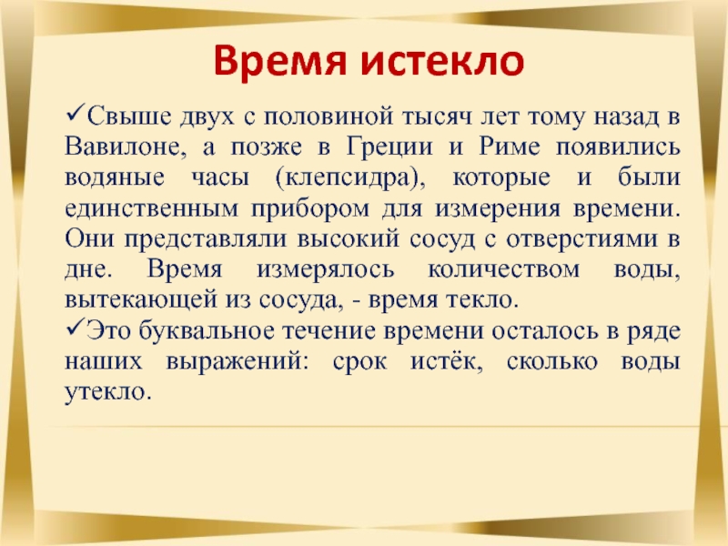 Вавилоне, а позже в Греции и Риме появились водяные часы (клепсидра), которые и были единственным прибором для измерения времени. Они представляли высокий сосуд с отверстиями в дне. Время измерялось количеством воды, вытекающей из сосуда, - время текло.
