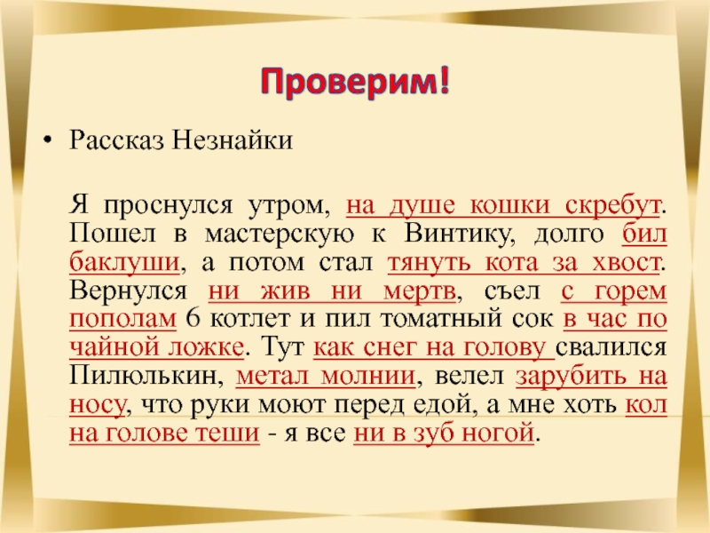 к Винтику, долго бил баклуши, а потом стал тянуть кота за хвост. Вернулся ни жив ни мертв, съел с горем пополам 6 котлет и пил томатный сок в час по чайной ложке. Тут как снег на голову свалился Пилюлькин, метал молнии, велел зарубить на носу, что руки моют перед едой, а мне хоть кол на голове теши - я все ни в зуб ногой.