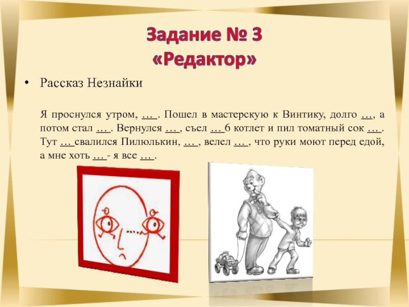 мастерскую к Винтику, долго …, а потом стал … . Вернулся … , съел … 6 котлет и пил томатный сок … . Тут … свалился Пилюлькин, … , велел … , что руки моют перед едой, а мне хоть … - я все … .