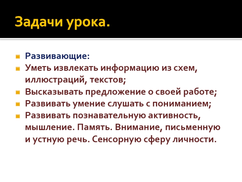 Развивать познавательную активность, мышление. Память. Внимание, письменную и устную речь. Сенсорную сферу личности.