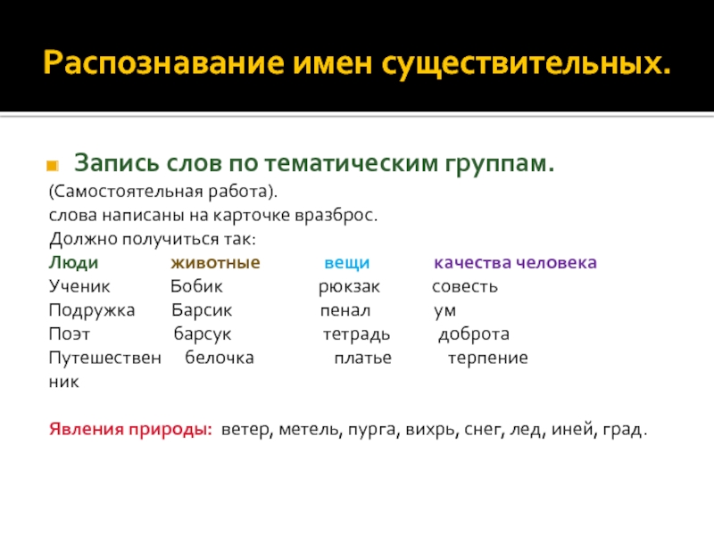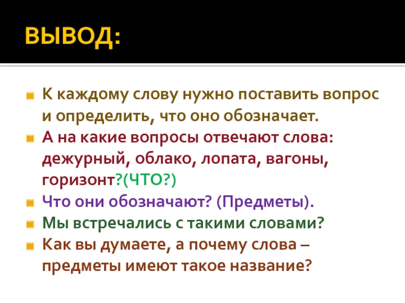 К каждому слову нужно поставить вопрос и определить, что оно обозначает.