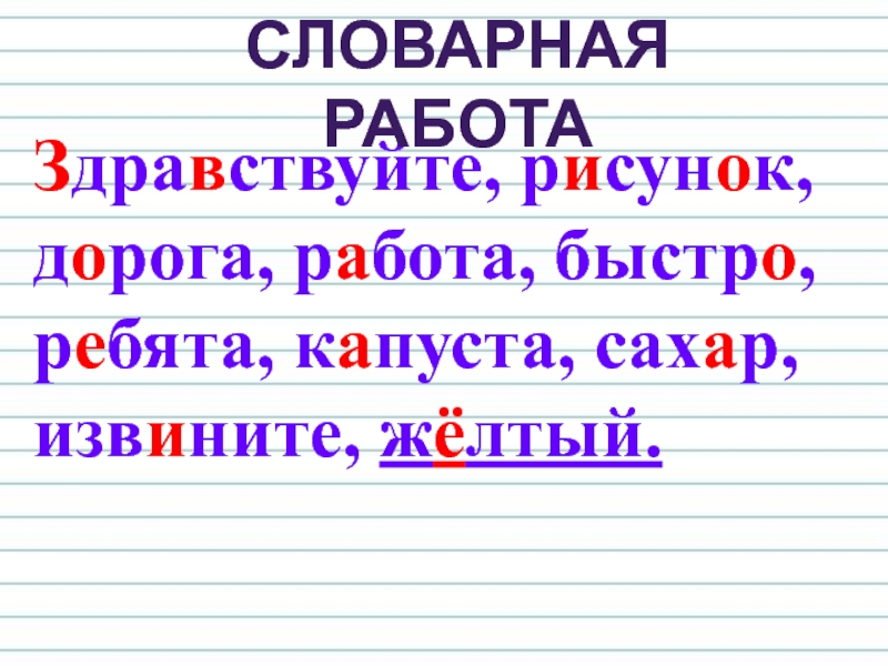 Здравствуйте, рисунок, дорога, работа, быстро, ребята, капуста, сахар, извините, жёлтый. Словарная работа