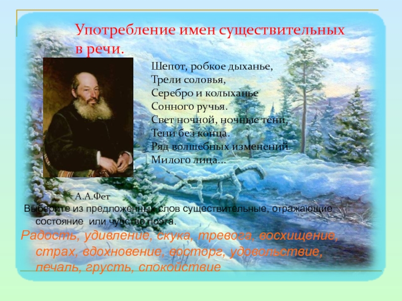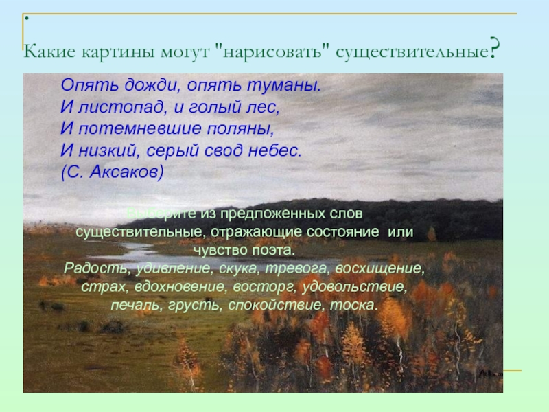 Выберите из предложенных слов существительные, отражающие состояние или чувство поэта.
