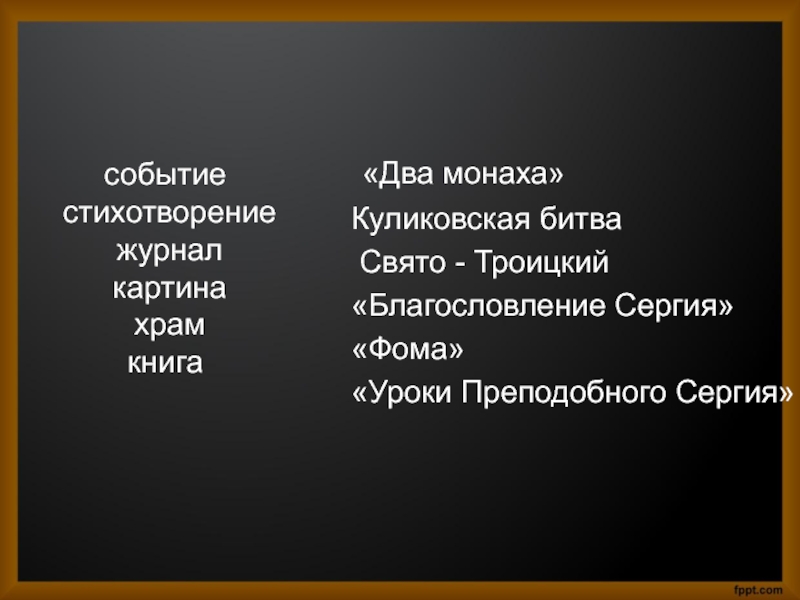 событие  стихотворение  журнал  картина  храм книга  «Два монаха»Куликовская битва Свято -
