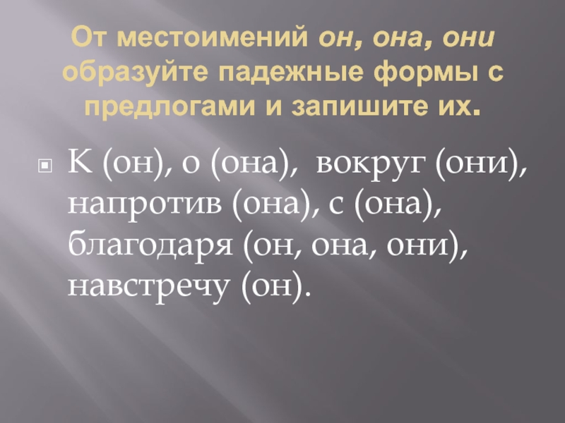 К (он), о (она), вокруг (они), напротив (она), с (она), благодаря (он, она, они), навстречу (он).