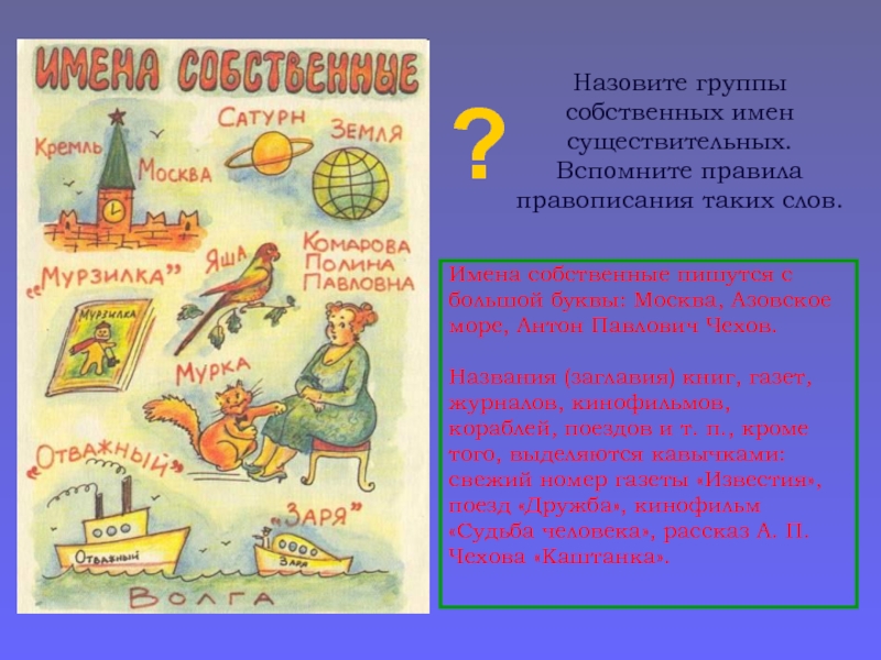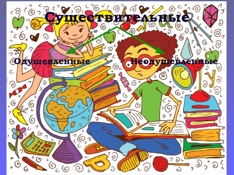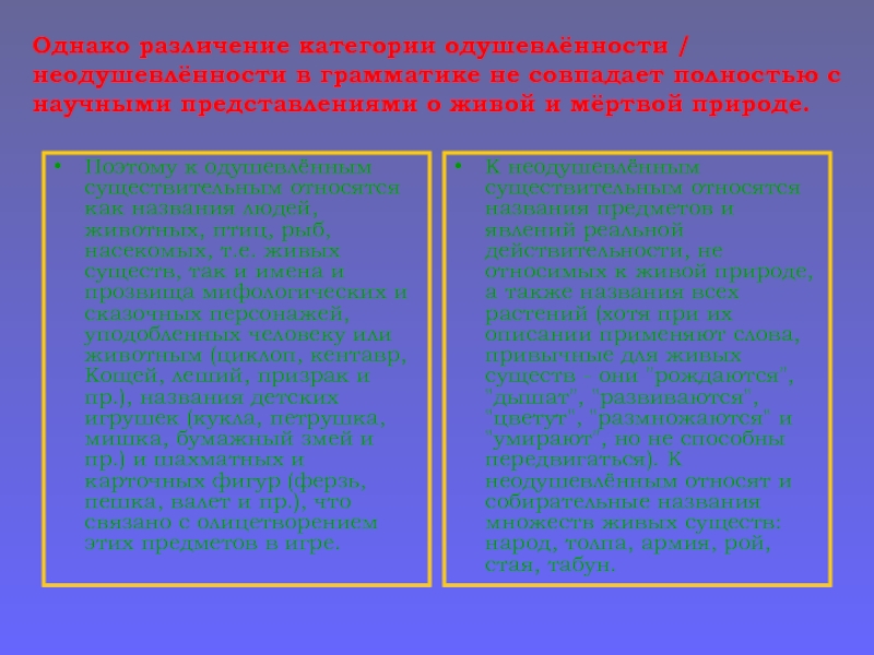 Поэтому к одушевлённым существительным относятся как названия людей, животных, птиц, рыб, насекомых, т.е. живых существ, так и имена и прозвища мифологических и сказочных персонажей, уподобленных человеку или животным (циклоп, кентавр, Кощей, леший, призрак и пр.), названия детских игрушек (кукла, петрушка, мишка, бумажный змей и пр.) и шахматных и карточных фигур (ферзь, пешка, валет и пр.), что связано с олицетворением этих предметов в игре.