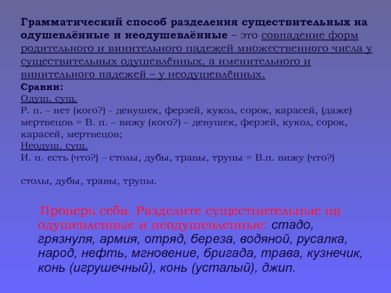Проверь себя. Разделите существительные на одушевленные и неодушевленные: стадо, грязнуля, армия, отряд, береза, водяной, русалка, народ, нефть, мгновение, бригада, трава, кузнечик, конь (игрушечный), конь (усталый), джип.
