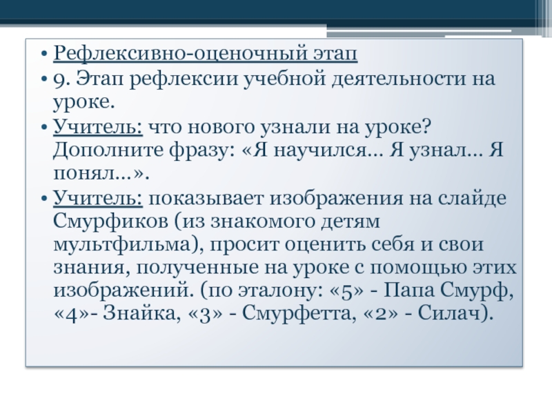 9. Этап рефлексии учебной деятельности на уроке.