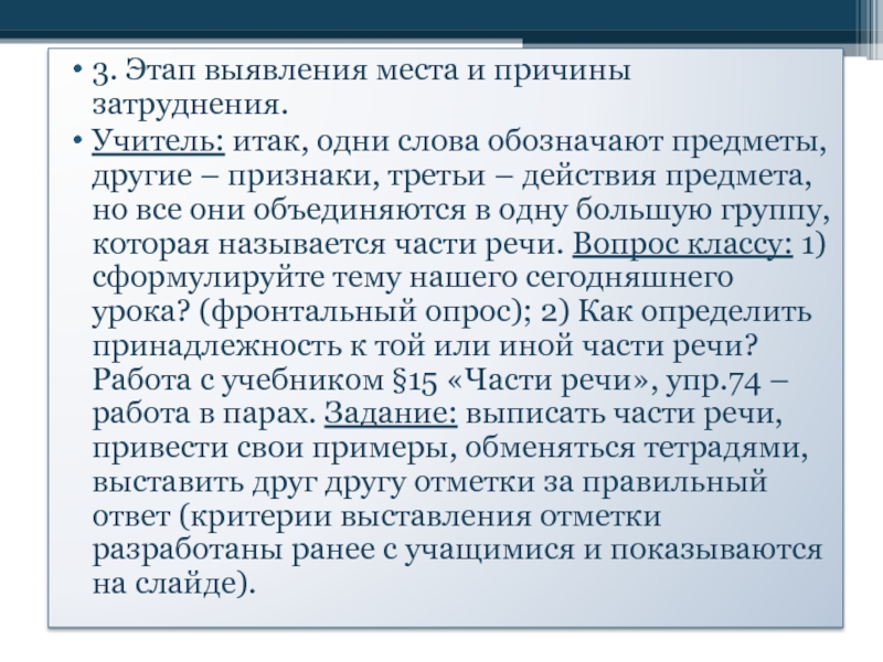 предметы, другие – признаки, третьи – действия предмета, но все они объединяются в одну большую группу, которая называется части речи. Вопрос классу: 1) сформулируйте тему нашего сегодняшнего урока? (фронтальный опрос); 2) Как определить принадлежность к той или иной части речи? Работа с учебником §15 «Части речи», упр.74 – работа в парах. Задание: выписать части речи, привести свои примеры, обменяться тетрадями, выставить друг другу отметки за правильный ответ (критерии выставления отметки разработаны ранее с учащимися и показываются на слайде).