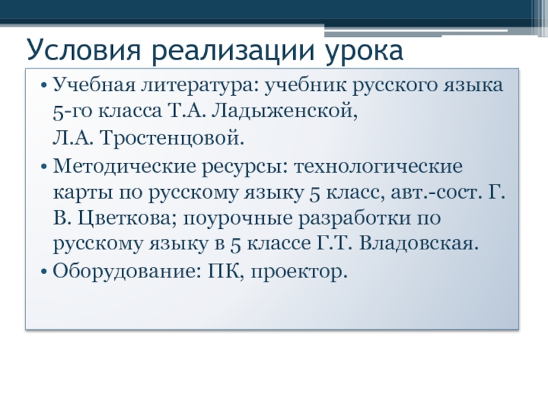 Методические ресурсы: технологические карты по русскому языку 5 класс, авт.-сост. Г.В. Цветкова; поурочные разработки по русскому языку в 5 классе Г.Т. Владовская.