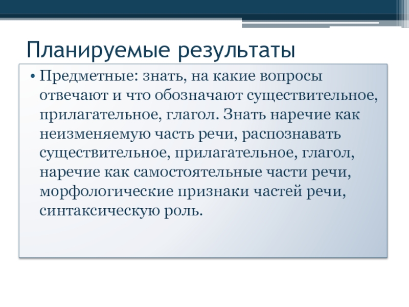 прилагательное, глагол. Знать наречие как неизменяемую часть речи, распознавать существительное, прилагательное, глагол, наречие как самостоятельные части речи, морфологические признаки частей речи, синтаксическую роль.