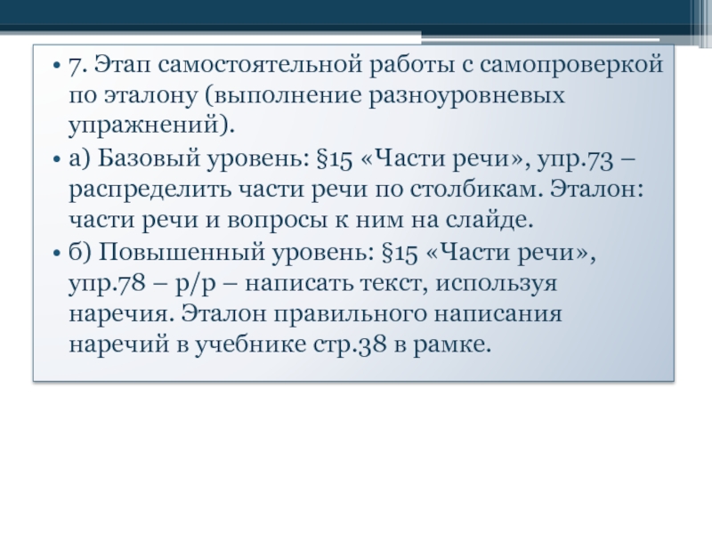 Слайд 127. Этап самостоятельной работы с самопроверкой по эталону (выполнение разноуровневых упражнений).