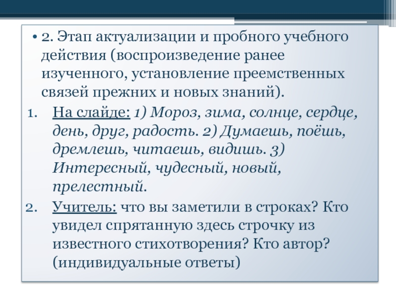 Слайд 72. Этап актуализации и пробного учебного действия (воспроизведение ранее изученного, установление