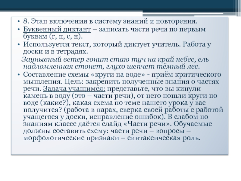 Составление схемы «круги на воде» - приём критического мышления. Цель: закрепить полученные знания о частях речи. Задача учащимся: представьте, что вы кинули камень в воду (это – части речи), от него пошли круги по воде (какие?), какая схема по теме нашего урока у вас получится? (работа в парах, сверка своей работы с работой учащегося у доски, исправление ошибок). В слабом по знаниям классе даётся слайд «Части речи». Обучаемые должны составить схему: части речи – вопросы – морфологические признаки – синтаксическая роль.