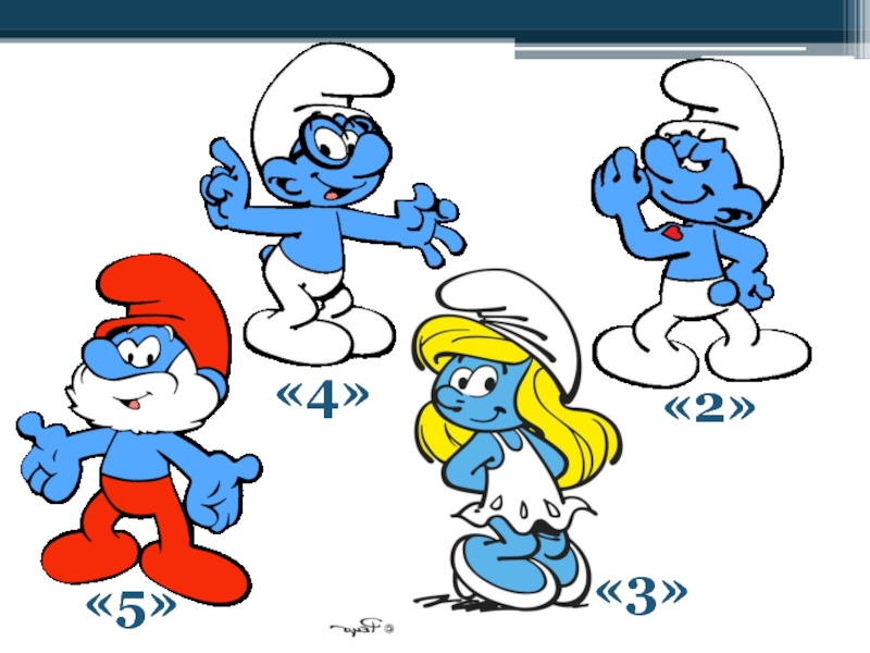 Учитель: показывает изображения на слайде Смурфиков (из знакомого детям мультфильма), просит оценить себя и свои знания, полученные на уроке с помощью этих изображений. (по эталону: «5» - Папа Смурф, «4»- Знайка, «3» - Смурфетта, «2» - Силач).
