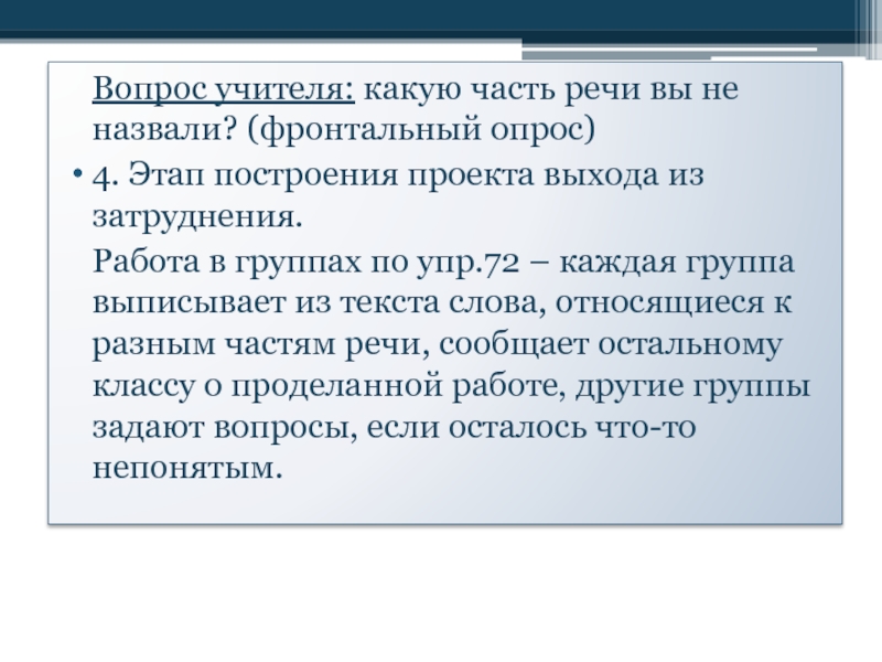 Работа в группах по упр.72 – каждая группа выписывает из текста слова, относящиеся к разным частям речи, сообщает остальному классу о проделанной работе, другие группы задают вопросы, если осталось что-то непонятым.
