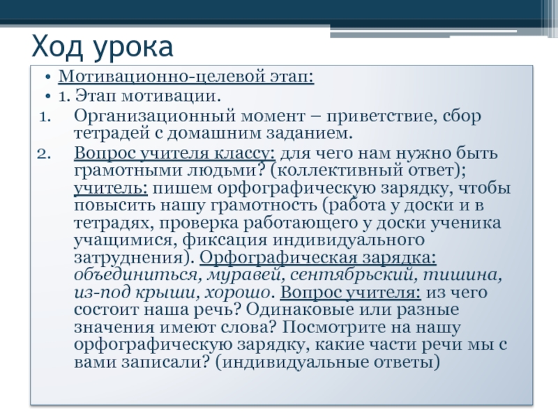 Вопрос учителя классу: для чего нам нужно быть грамотными людьми? (коллективный ответ); учитель: пишем орфографическую зарядку, чтобы повысить нашу грамотность (работа у доски и в тетрадях, проверка работающего у доски ученика учащимися, фиксация индивидуального затруднения). Орфографическая зарядка: объединиться, муравей, сентябрьский, тишина, из-под крыши, хорошо. Вопрос учителя: из чего состоит наша речь? Одинаковые или разные значения имеют слова? Посмотрите на нашу орфографическую зарядку, какие части речи мы с вами записали? (индивидуальные ответы)