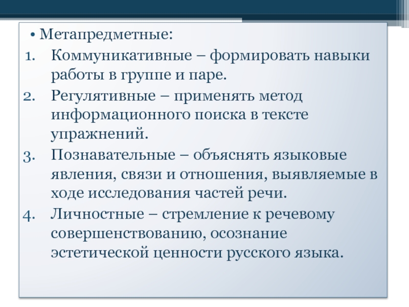 Познавательные – объяснять языковые явления, связи и отношения, выявляемые в ходе исследования частей речи.