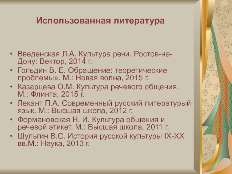 Формановская Н. И. Культура общения и речевой этикет. М.: Высшая школа, 2011 г.