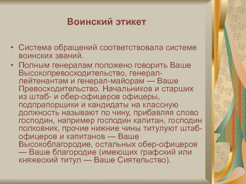 Высокопревосходительство, генерал-лейтенантам и генерал-майорам — Ваше Превосходительство. Начальников и старших из штаб- и обер-офицеров офицеры, подпрапорщики и кандидаты на классную должность называют по чину, прибавляя слово господин, например господин капитан, господин полковник, прочие нижние чины титулуют штаб-офицеров и капитанов — Ваше Высокоблагородие, остальных обер-офицеров — Ваше благородие (имеющих графский или княжеский титул — Ваше Сиятельство).